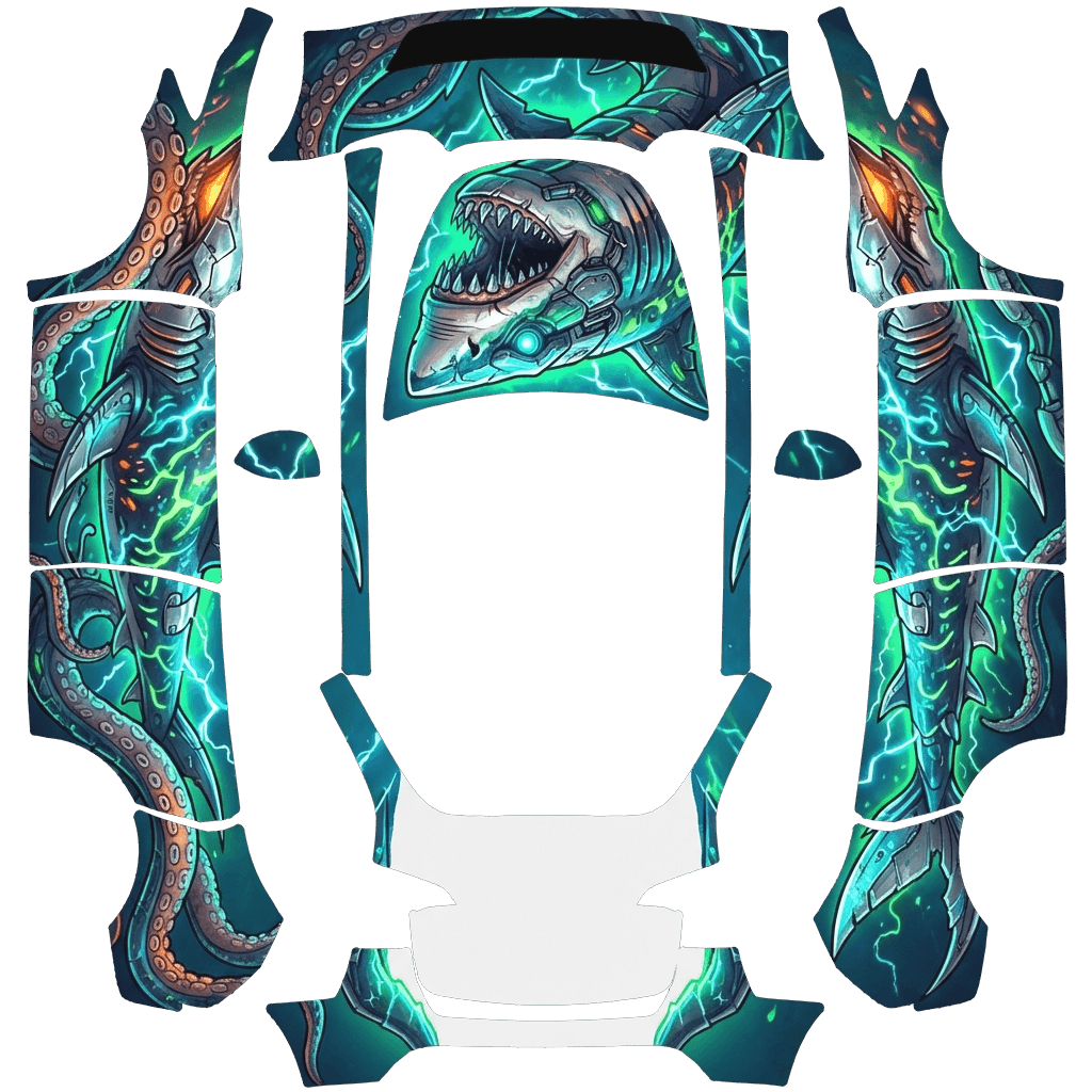 这款名为“变异鲨鱼”的定制特斯拉 Model Y 车身贴膜设计现在可以免费下载。它通过高精度 4K 纹理图案为您提供独特的外观方案。在正式施工前,您可以使用我们的 3D 可视化工作室进行实时效果预览。